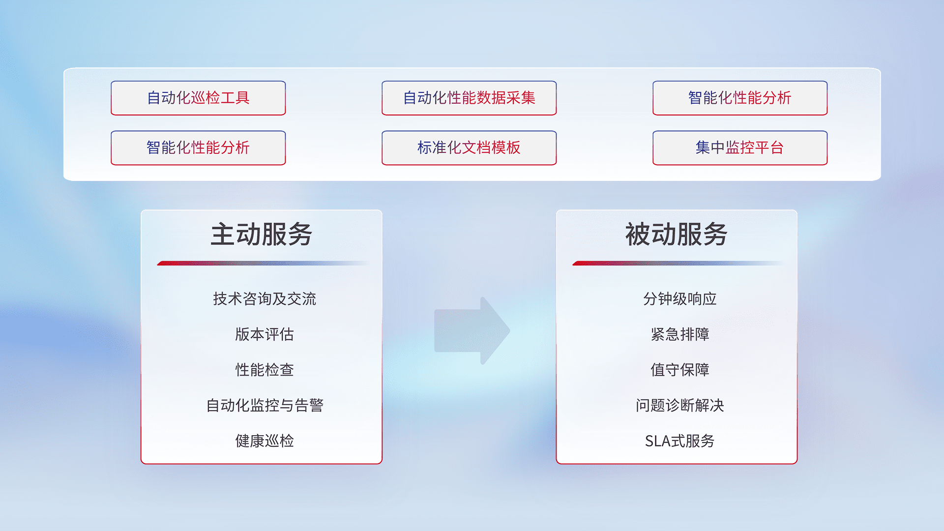 智能化工具和标准化文档,,,,保障服务质量,,提供主动服务(包含技术咨询、、版本评估、、、性能检查、、、、自动化监控与告警、、、健康巡检)和被动服务包含(分钟级响应、、紧急排障、、、、值守保障、、、、问题诊断解决、、、、SLA服务)。。