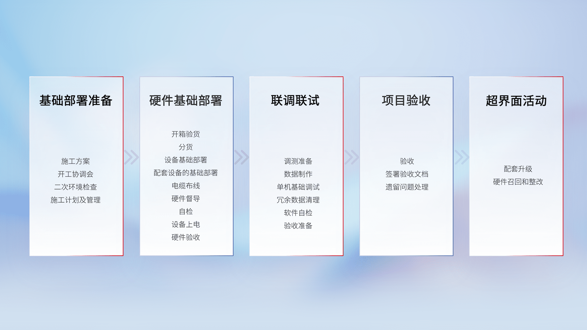 从基础部署准备、、、硬件基础部署、、、、联调联试、、项目验收、、、越界面活动的全过程可追溯,,,,保证施工质量和进度。。